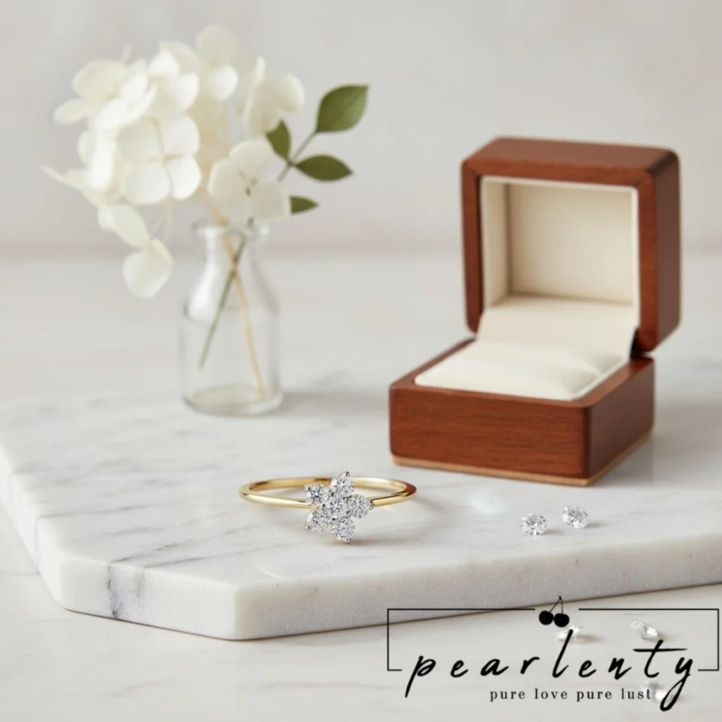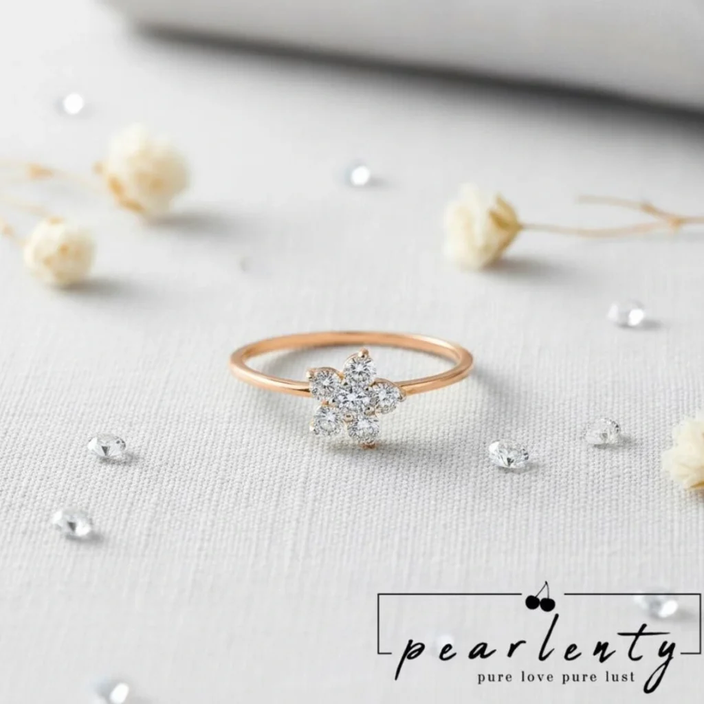 Bu katı altın çiçek yüzük, aşkın, feminenliğin ve saf güzelliğin bir kutlamasıdır. Narin çiçek şekli, her hareketinde ışığı yakalayan laboratuvarda yetiştirilmiş elmaslarla süslenmiştir - zarif, zamansız ve anlam dolu.