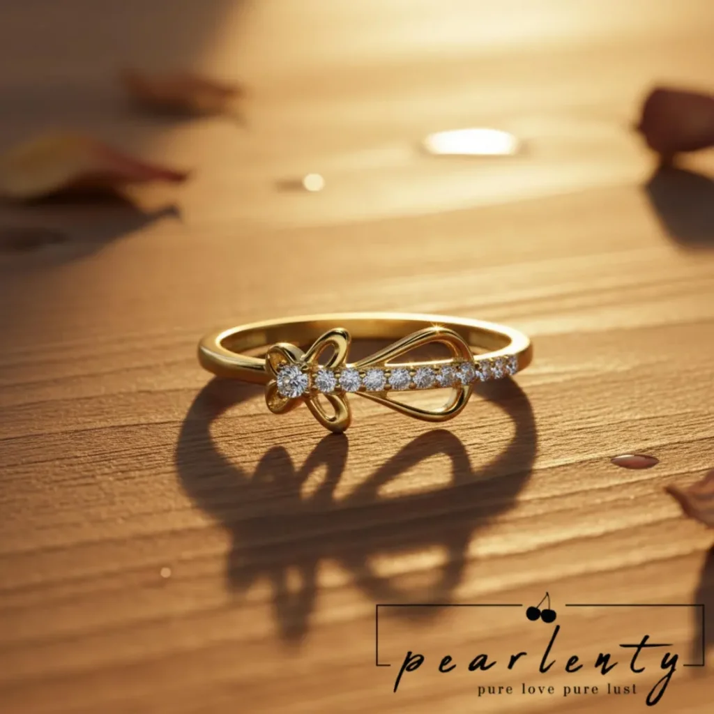 Bu som altın sonsuzluk yüzüğü, sonsuz aşkı ve bağlantıyı simgeleyen zarif bir yay benzeri kıvrım boyunca zarif bir şekilde yerleştirilmiş, laboratuvarda yetiştirilmiş narin pırlantalarla ışıldıyor.