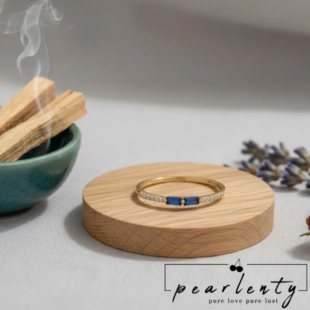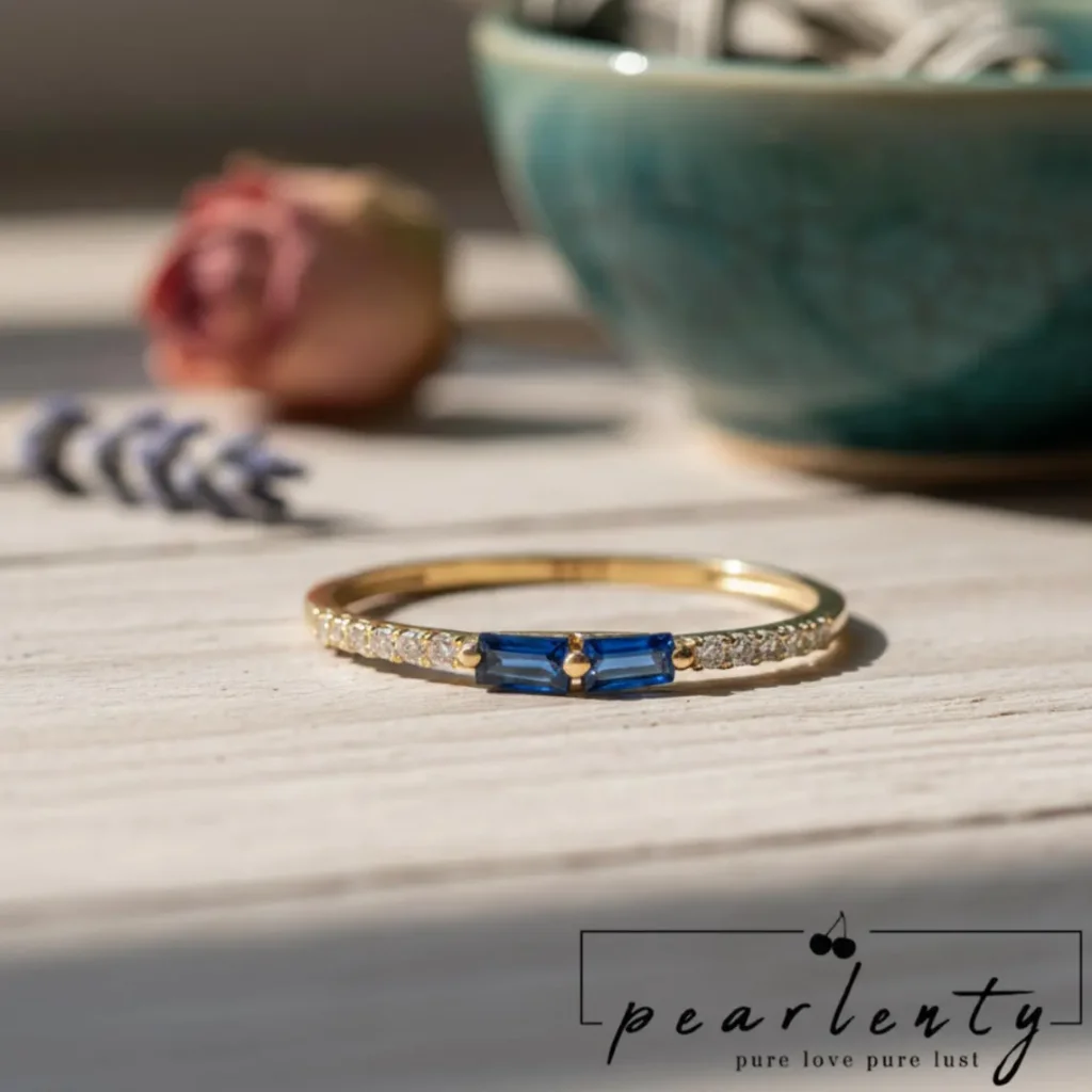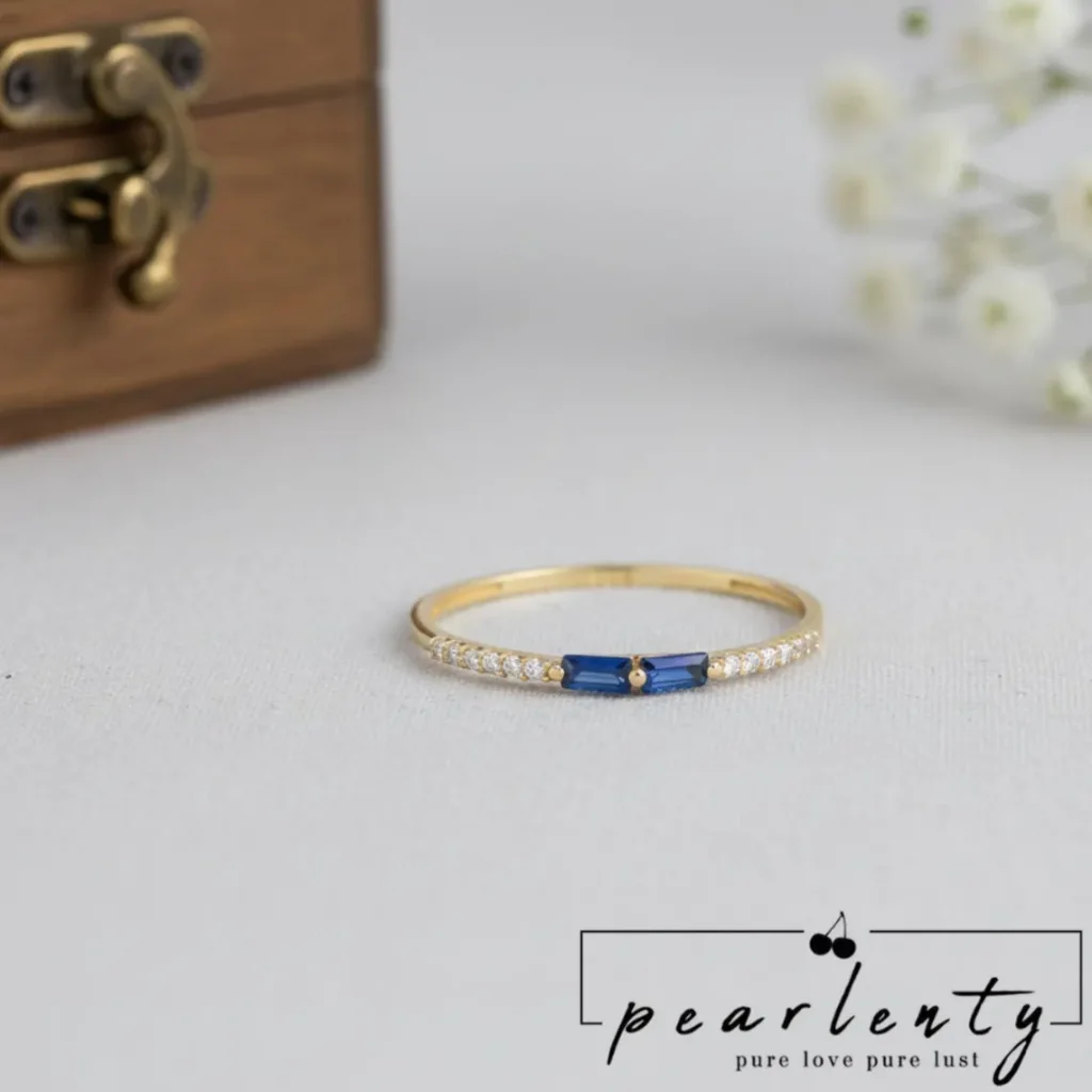 Gece Yarısı Zarafetinin Işıltısı Bu zarif baget safir yüzük, zamansız zarafeti ve sade güzelliği bir araya getiriyor. Ortasında iki adet sivriltilmiş mavi baget taş ve bant boyunca parıldayan pavé pırlantalarla çerçevelenmiş bu yüzük, her dokunuşu parlatmak için tasarlanmış bir parça. Söz yüzüğü, minimalist nişan yüzüğü veya özel birine anlamlı bir hediye olarak mükemmel.