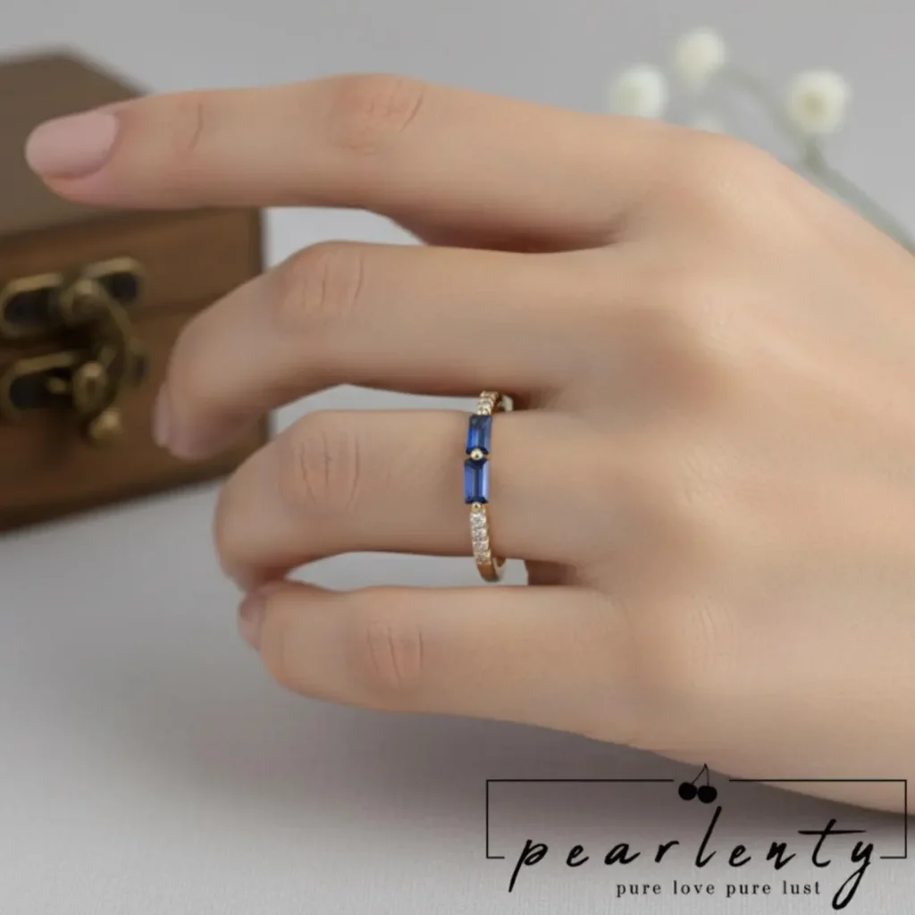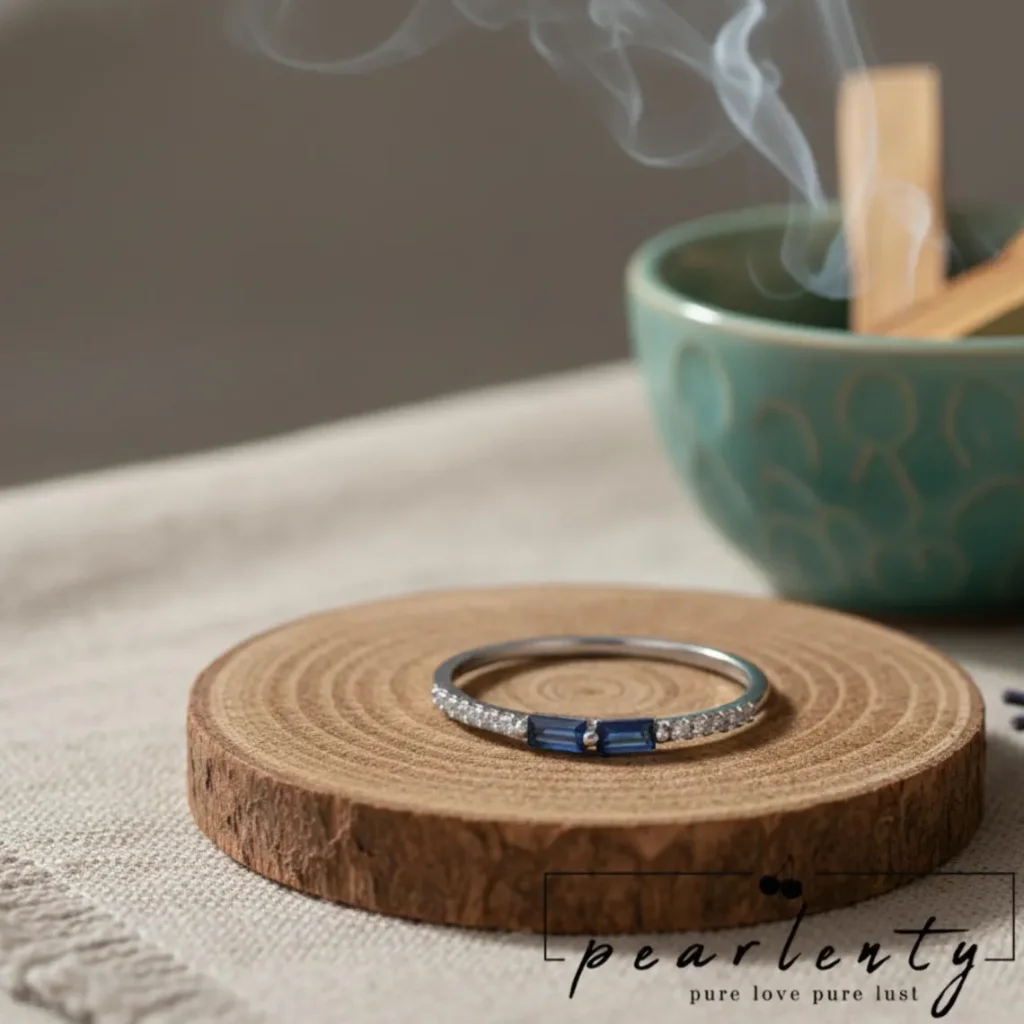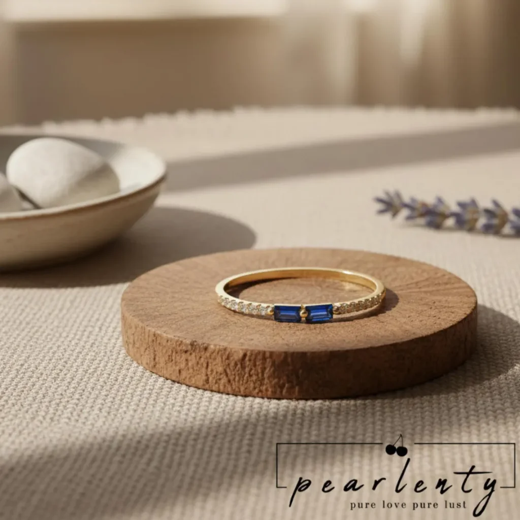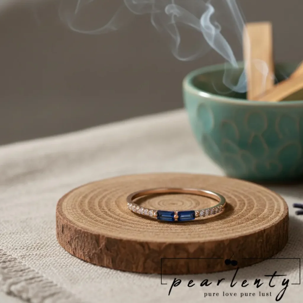 Gece Yarısı Zarafetinin Işıltısı Bu zarif baget safir yüzük, zamansız zarafeti ve sade güzelliği bir araya getiriyor. Ortasında iki adet sivriltilmiş mavi baget taş ve bant boyunca parıldayan pavé pırlantalarla çerçevelenmiş bu yüzük, her dokunuşu parlatmak için tasarlanmış bir parça. Söz yüzüğü, minimalist nişan yüzüğü veya özel birine anlamlı bir hediye olarak mükemmel.
