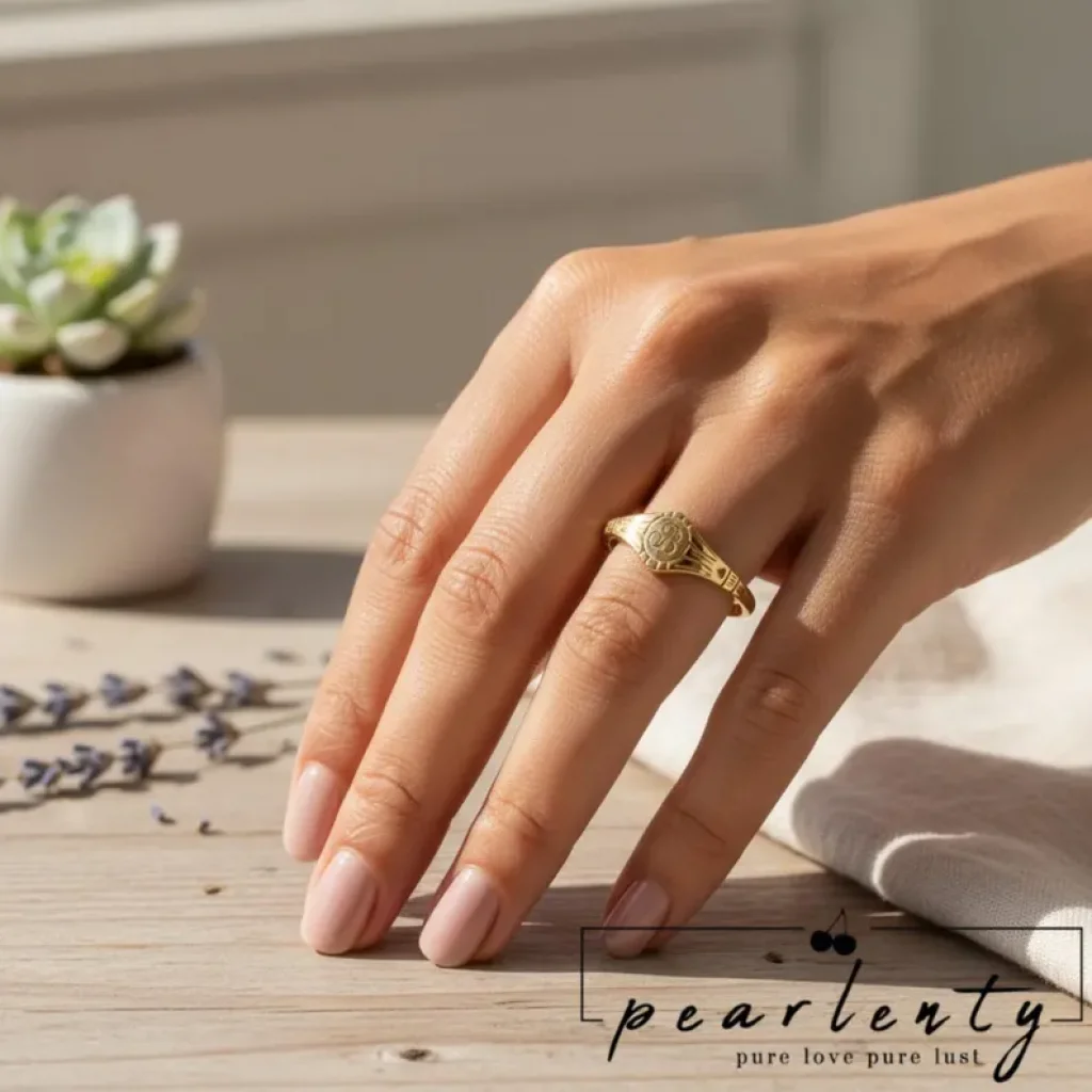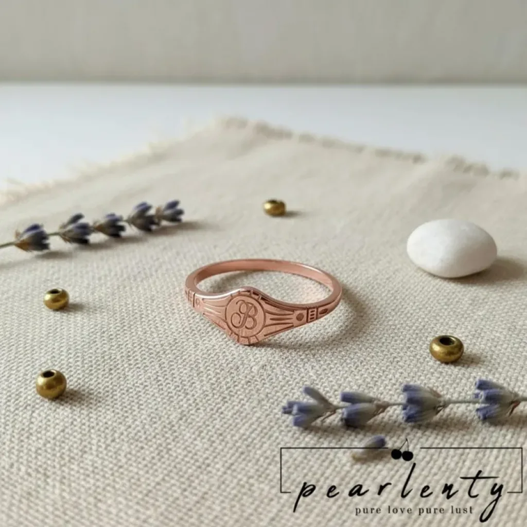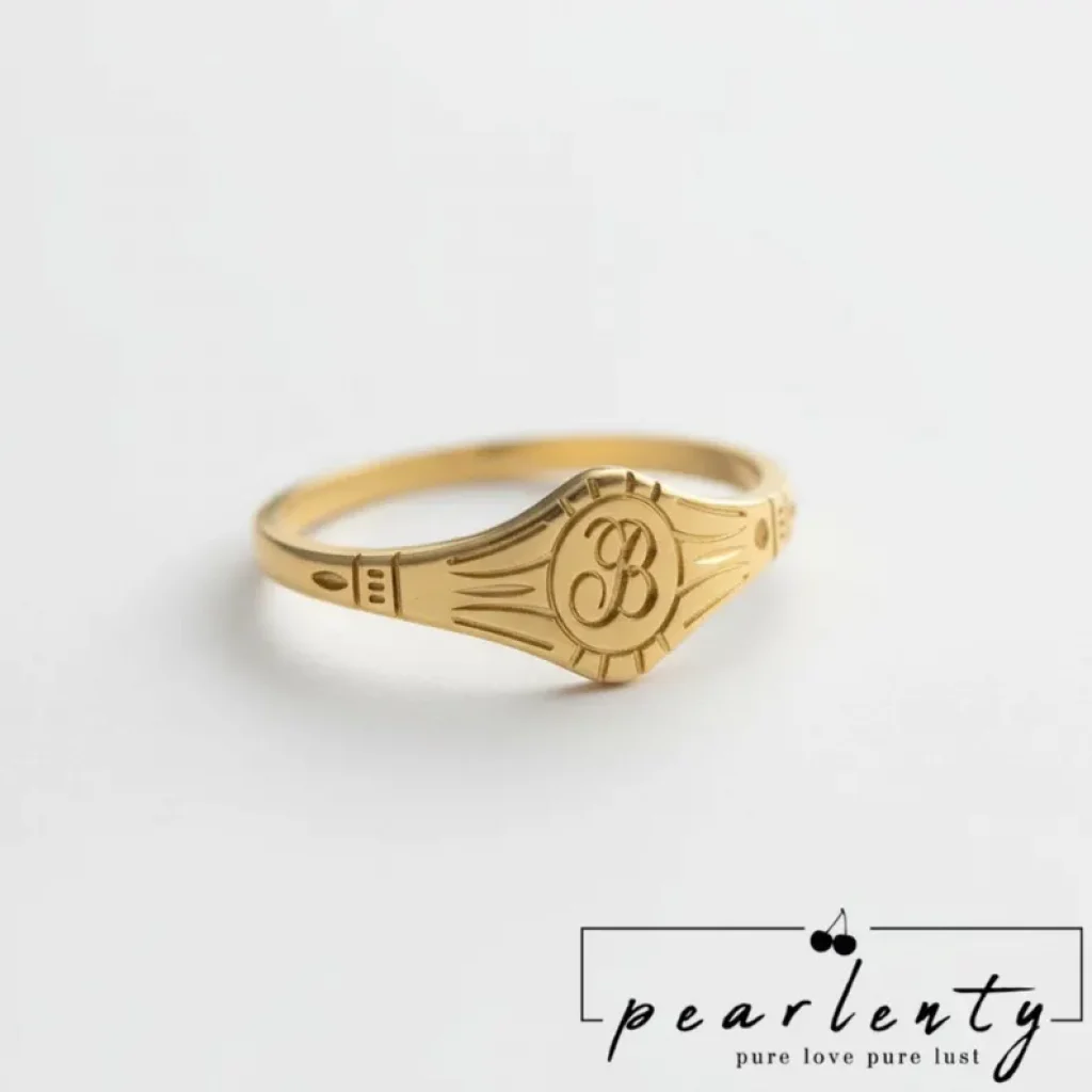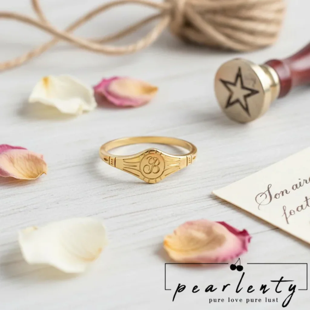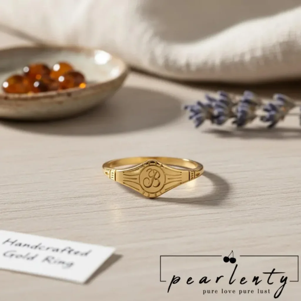 Bu kişiye özel, som altın baş harfli yüzük, bir mücevherden çok daha fazlası; hikayenizin bir yansıması. İstanbul'da titizlikle el işçiliğiyle üretilen bu yüzük, seçtiğiniz harfin zarif ve vintage esintili bir tasarımla çerçevelendiği bir tasarıma sahip.