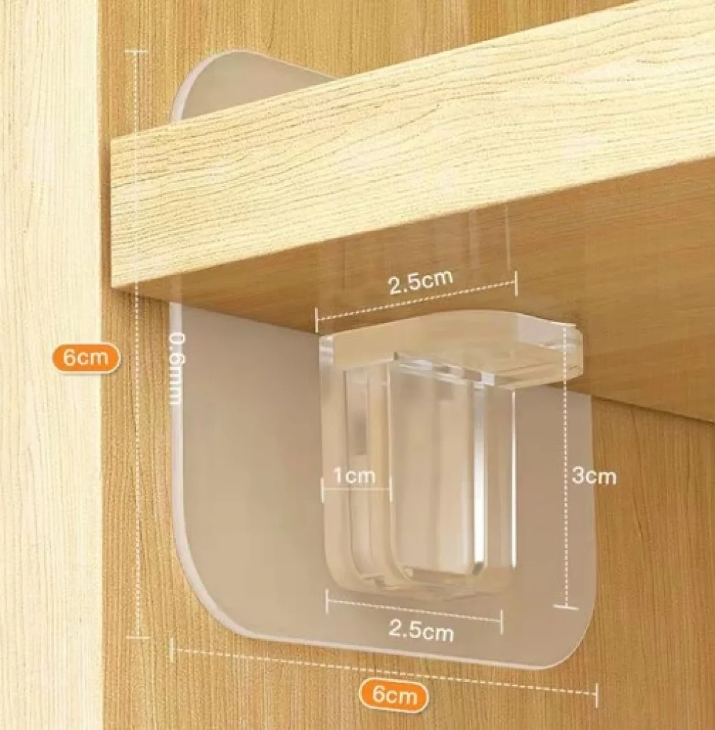 Şeffaf yapışkanlı raf tutucu aparatı sayesinde dolap içi raflarınızın yerlerini rahatlıkla değiştirebilirsiniz.